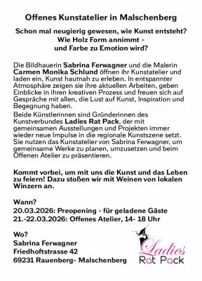 Die Bildhauerin Sabrina Ferwagner und die Malerin Carmen Monika Schlund öffnen ihr Kunstatelier und laden ein, Kunst hautnah zu erleben. In entspannter